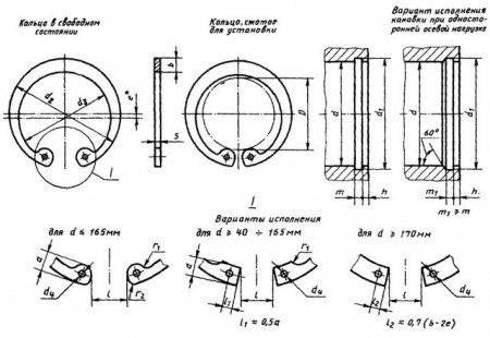 При подборе внутренних стопорных колец эксцентрических руководствуются ГОСТ 13943 и DIN 472. В них указывается наружный диаметр кольца в свободном состоянии и диаметр отверстия, в которое с определенным допуском возможна установка выбранного крепежного изделия. Наряду с типоразмерами в стандартах приводятся также и значения допустимых на элемент нагрузок.